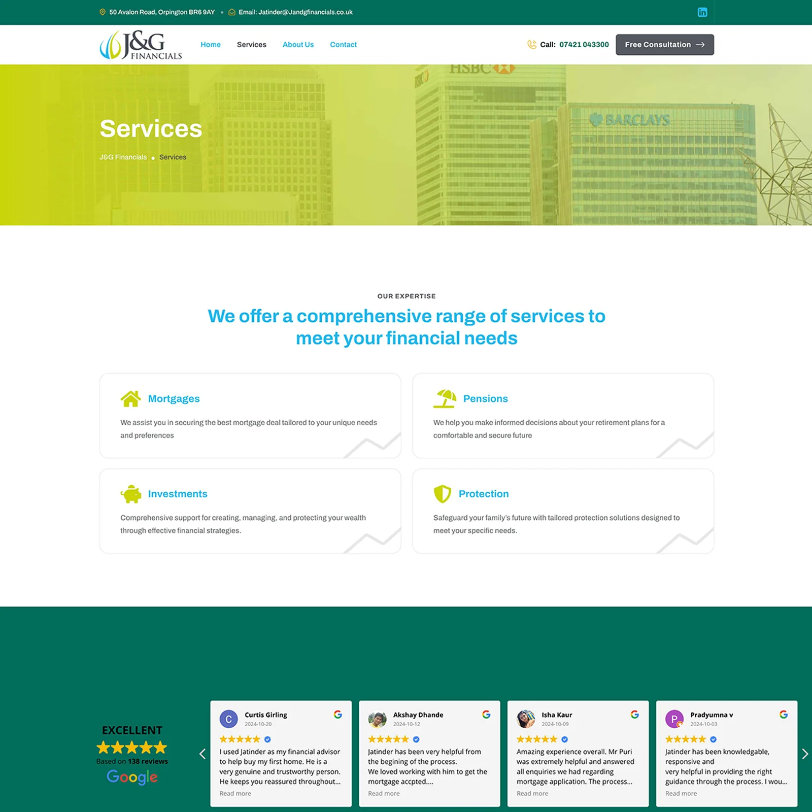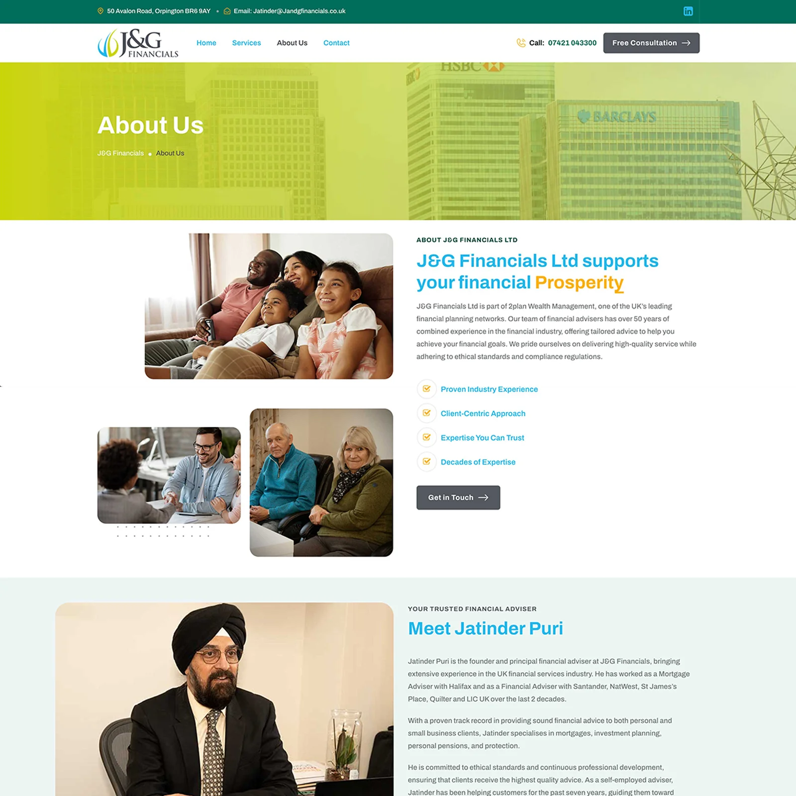 J&G Financials is a well-established financial advisory firm offering expert advice on mortgages, investments, pensions, and insurance. Based in Orpington, Kent, they serve clients across the UK, helping them navigate the complex world of personal finance. With years of experience in the financial industry, J&G Financials approached us to create a professional and easy-to-use website that would showcase their services and build trust with potential clients.