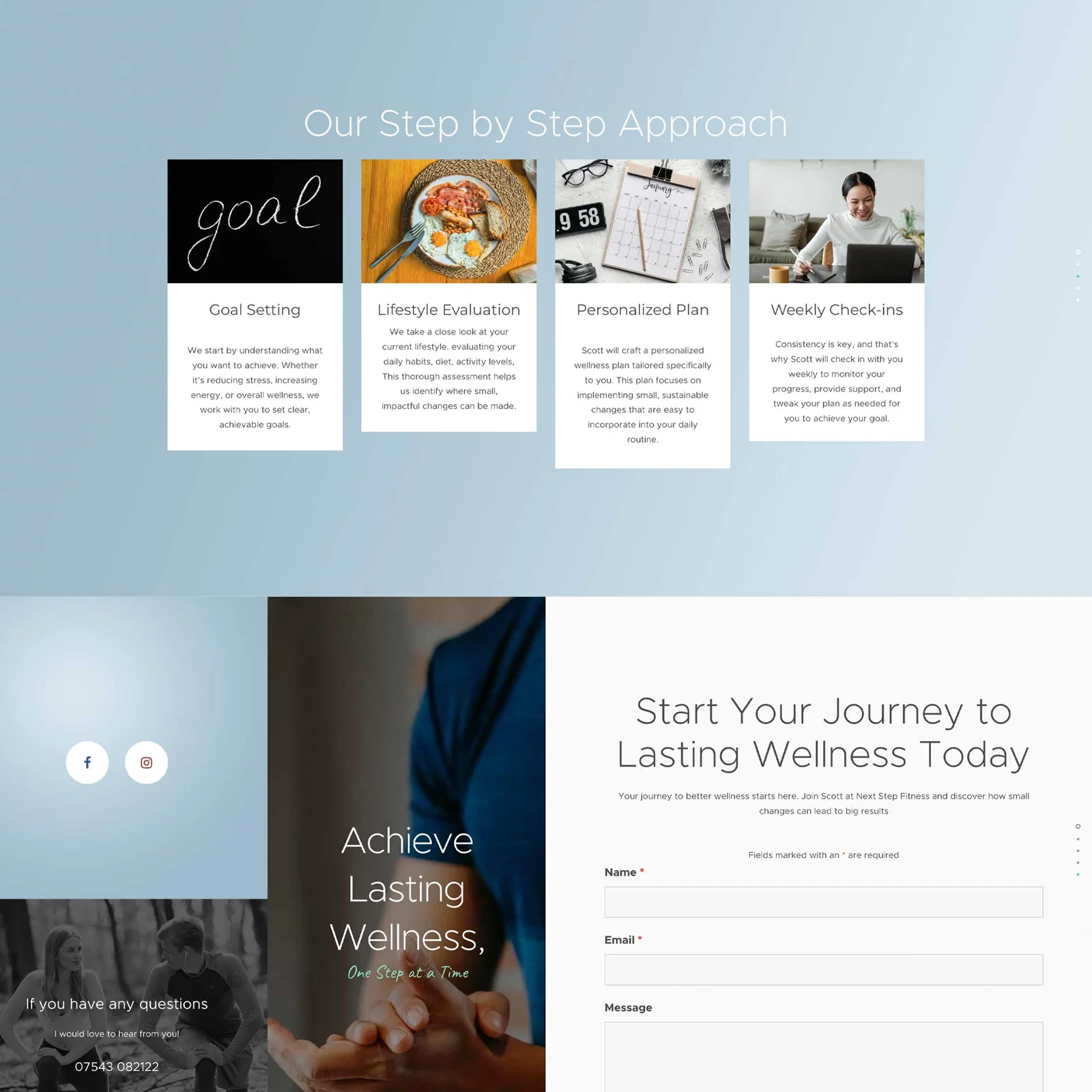 We proudly present the website we developed for Next Step Fitness, a newly launched business by wellness coach Scott Eccles. This one-page site serves as a powerful introduction to Scott’s innovative concept, focusing on small, incremental lifestyle changes for busy professionals.